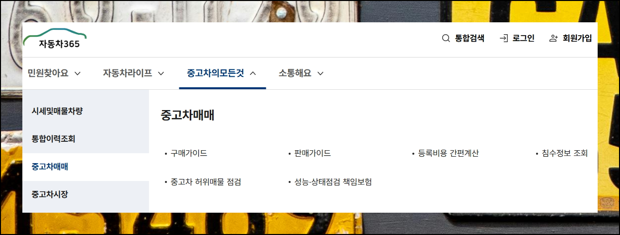 메인페이지의 중고차 매매 영역을 찾아보세요. 조회 기능은 물론이고, 차량 거래와 연관된 유용한 콘텐츠들이 풍부하게 마련되어 있어요. 자동차 구입 계획이 있으시다면 해당 메뉴를 이용해보시기 바랍니다. 거래 절차에서 도움되는 정보와 실무 팁들을 충분히 얻을 수 있거든요.