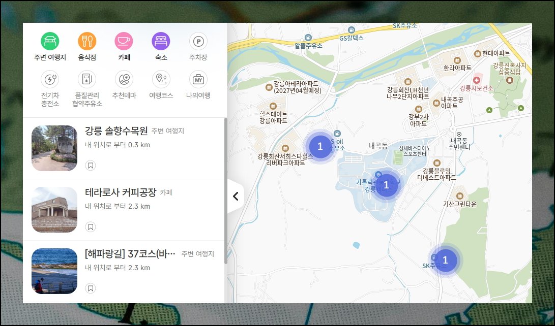 화면 왼쪽 다양한 아이콘들은 여행 필요 내용을 카테고리별로 분류해서 보여줘요. 주변 관광지부터 맛집, 카페, 주차장, 숙박시설까지 원하는 내용만 선택적으로 확인할 수 있습니다. 관광 명소만 지도에 표시되니까 탐색에 집중할 수 있어요.