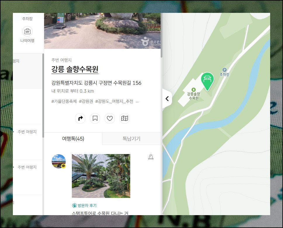 지도 숫자 마커를 클릭하면 해당 지역이 확대가 되고, 연속 클릭하면 구체적인 여행지 이름이 나타나요. 관심 장소 이름을 선택하면 화면 좌측에 상세 정보 패널이 열려서 주소, 거리, 태그, 방문자 후기를 확인할 수 있어요.