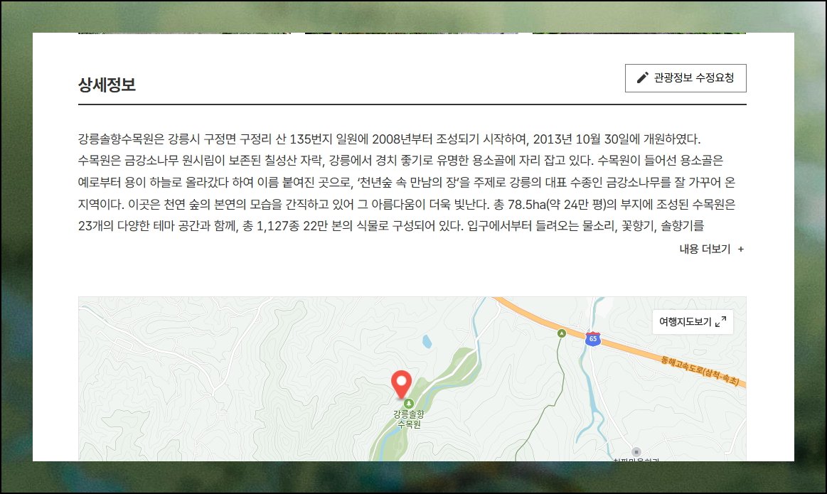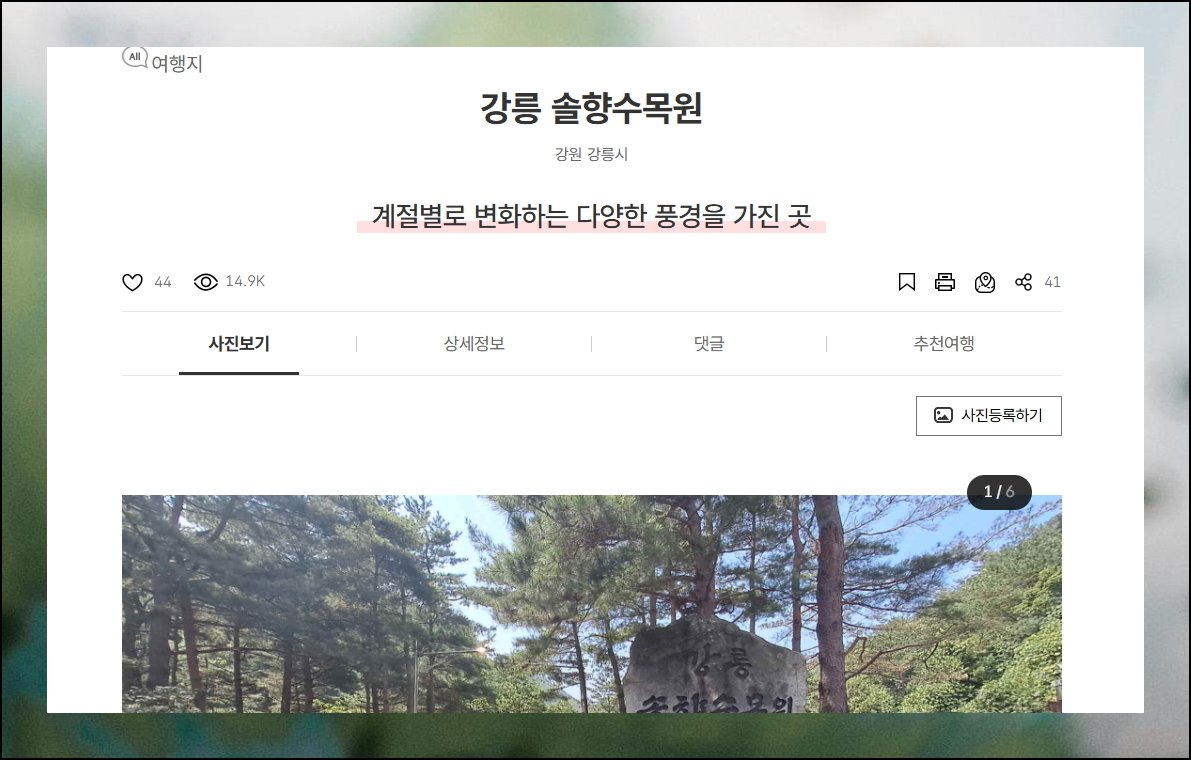 강원도에 있는 "강릉 솔향수목원"을 예시로 선택해 보았어요. 바로 새로운 상세 페이지가 열려요. 고화질 사진들과 자세한 설명, 방문자 후기, 관련 여행 데이터까지 종합 제공합니다. 실제 가보지 않아도 분위기를 생생하게 느낄 수 있어요.