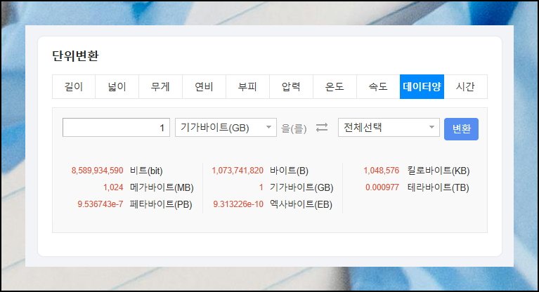 디지털 시대에 맞춰 컴퓨터 데이터 용량도 변환 가능합니다. 비트부터 시작해서 바이트, 킬로바이트, 메가바이트, 기가바이트, 테라바이트까지 총 8가지를 지원해요. 스마트폰 저장 용량이나 외장 하드디스크 크기를 비교할 때 매우 유용한 기능입니다.