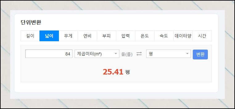 이번에는 반대 방향으로 84제곱미터를 평으로 바꿔봤습니다. 계산 결과는 25.41평이 나왔어요. 양방향 변환이 모두 가능해서 어떤 상황에서든 활용할 수 있어 편리합니다.