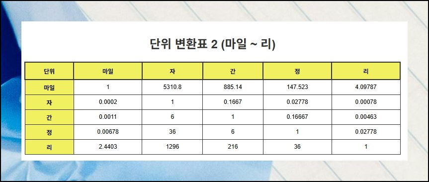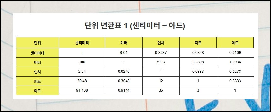 거리 측정의 기본이 되는 도량형 환산표부터 살펴보겠습니다. 우리가 자주 사용하는 CM와 M을 비롯해 1야드는 물론이고, 인치, 피트, 마일까지 모두 알아볼 수 있는 단위표예요. 여기에는 우리나라 전통 측정 방식인 자, 간, 정, 리도 함께 정리되어 있어 매우 실용적입니다.