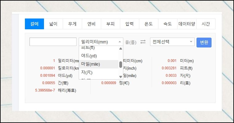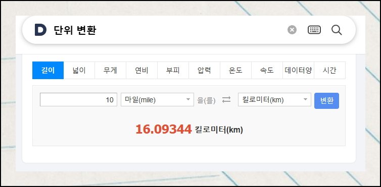 국내에서는 거의 사용하지 않는 마일도 변환해봤습니다. 10마일을 KM로 환산한 결과는 16.09344KM였어요. 해외 여행 중이나 외국 콘텐츠를 접할 때 이런 변환이 꼭 필요하죠.