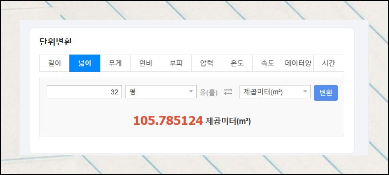 일상에서 자주 접하지만 헷갈리기 쉬운 평수 계산을 해봤어요. 32평 아파트가 제곱미터로는 어느 정도 규모인지 궁금했거든요. 환산 결과 105.78124제곱미터라는 정확한 수치가 나왔습니다.