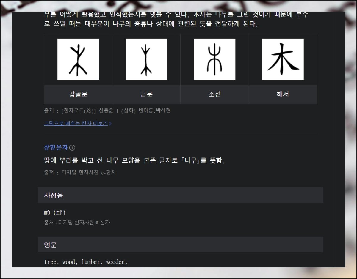 글자의 유래를 알면 외우기가 쉬워집니다. 한문사전에서는 상세한 의미 설명과 함께 어떤 모양에서 유래했는지도 알려줘요. 목 자를 예로 들면 땅에 뿌리내린 나무의 형태를 본떴다고 합니다.