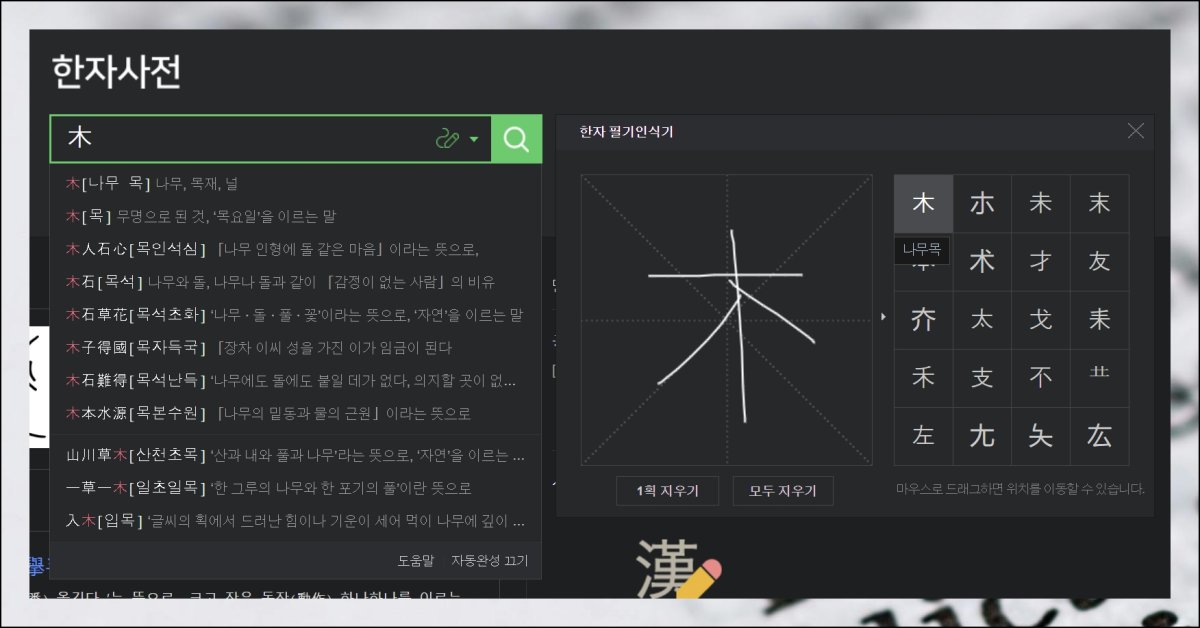 한자를 모르겠다면 직접 그려보세요. 사이트 오른쪽에 있는 필기 인식 도구를 이용하면 됩니다. 컴퓨터 사용자는 마우스로, 모바일 사용자는 손가락으로 화면에 그려보면 돼요. 정확하지 않아도 괜찮아요. 한문사전의 인식 기능이 알아서 찾아주니까요.