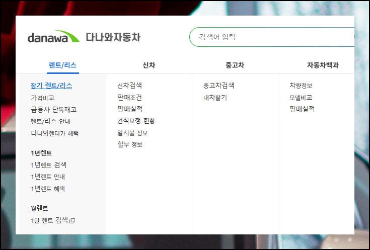다나와 자동차 메인 화면에서 장기렌트 메뉴를 클릭하면 됩니다. 신차뿐만 아니라 중고 차량까지 다양한 상품을 한곳에서 비교할 수 있어요. 올바른 사용법만 익히면 누구나 쉽게 활용 가능한 인터페이스예요.