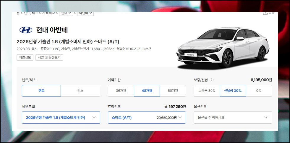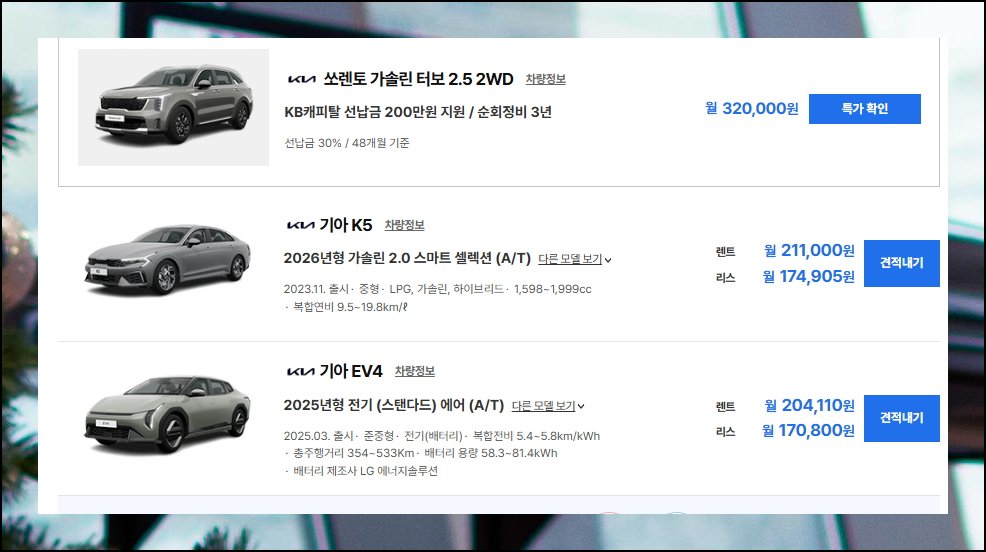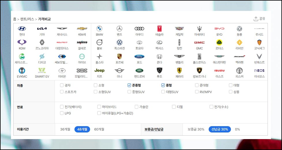 차량 이용 방식을 고민하다 보면 어느 업체가 합리적인지 판단하기 쉽지 않습니다. 각 회사마다 제시하는 월 납부액이나 보증금 조건이 다르기 때문이에요. 이럴 때 온라인 가격비교 플랫폼을 활용하면 여러 곳의 견적을 한눈에 확인할 수 있어요.