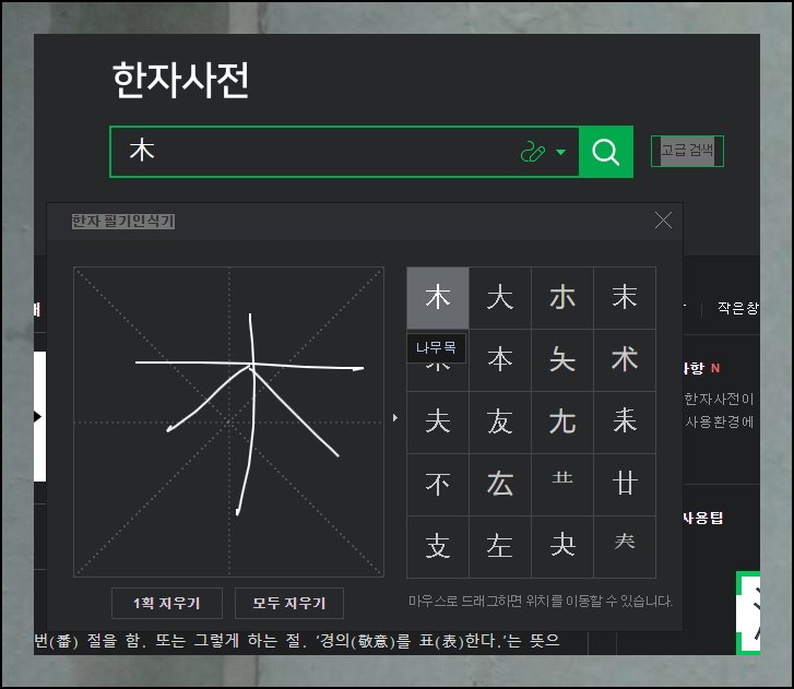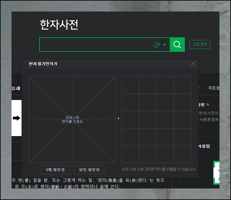 옛날처럼 두툼한 옥편 책을 뒤적이며 찾지 않아도 됩니다. 화면 우측에 보이는 필기 인식 도구를 활용하세요. PC에서는 마우스로 그리면 되고요. 모바일 기기에서는 손가락으로 터치하면 됩니다. 정확하게 그리지 못해도 괜찮아요. 온라인 한문 사전이 알아서 인식해주거든요.