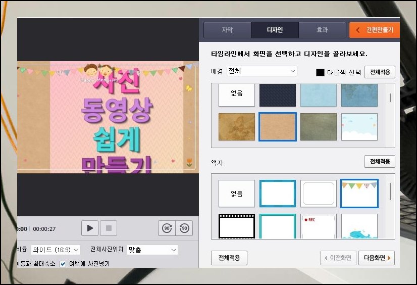 프로그램에 마련된 꾸미기 양식을 마음껏 써보세요. 배경 연출이나 프레임 효과를 씌우면 숙련자가 다듬은 듯한 수준이 나옵니다. 준비된 양식 가운데 콘텐츠 톤에 어울리는 것을 찾아보세요.