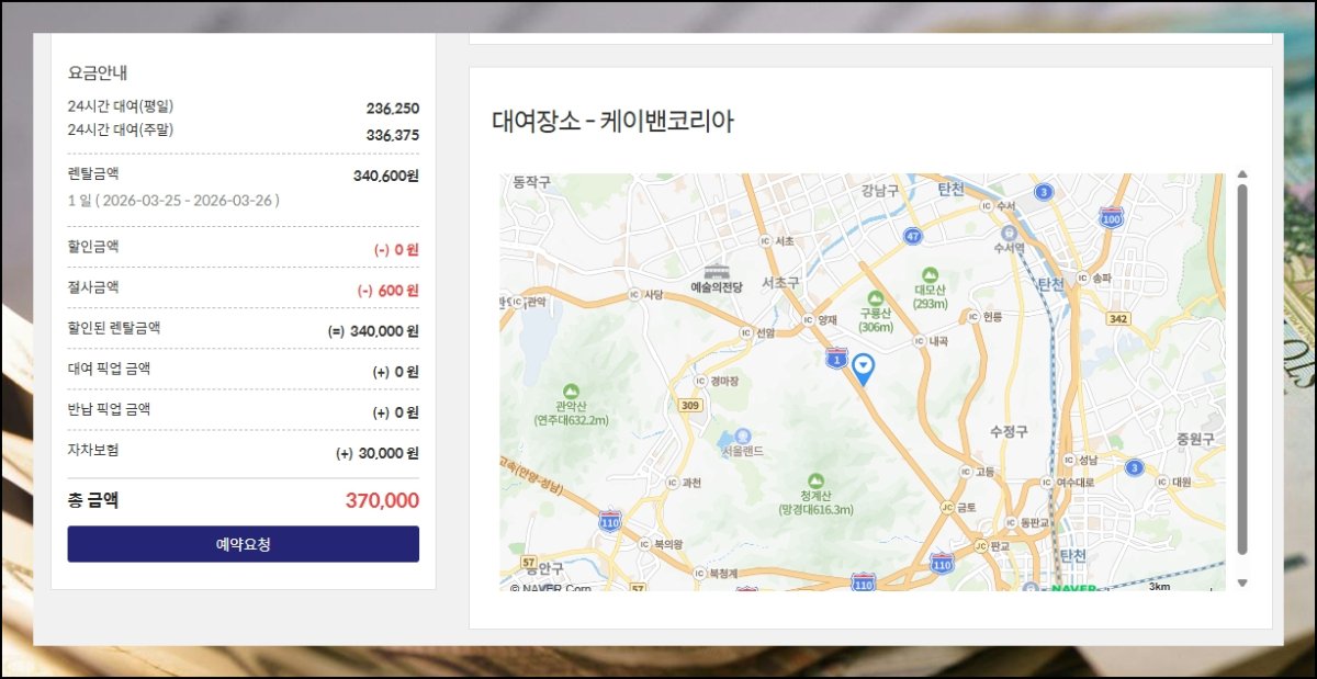페이지 왼쪽 아래에 부대비까지 전부 더한 청구 금액이 나타납니다. 15인승 승합차 기준 24시간 이용 시 36만원 초중반 선이에요. 기본 이용료에 세금까지 묶인 숫자라 따로 산출할 필요가 없죠. 영업점 위치가 약도로 찍혀 있어 헤맬 일도 없습니다.