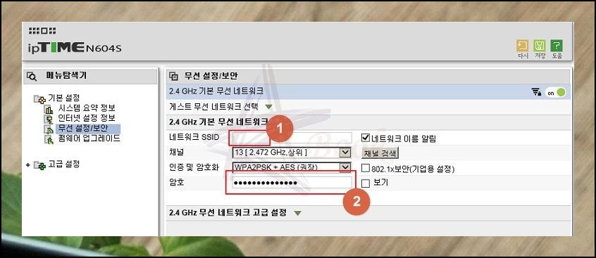 화면에 보이는 SSID 항목은 iptime 와이파이 접속명을 가리킵니다. 그 아래 암호란에 원하는 값을 적어 넣으세요. 다 적었으면 하단 저장 버튼을 클릭하면 설정 완료입니다.