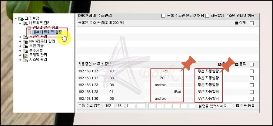 내부 네트워크 항목을 열면 지금 iptime 공유기에 물려 있는 장치 목록이 뜹니다. 승인하지 않은 기기가 섞여 있는지 한눈에 파악이 가능해요.