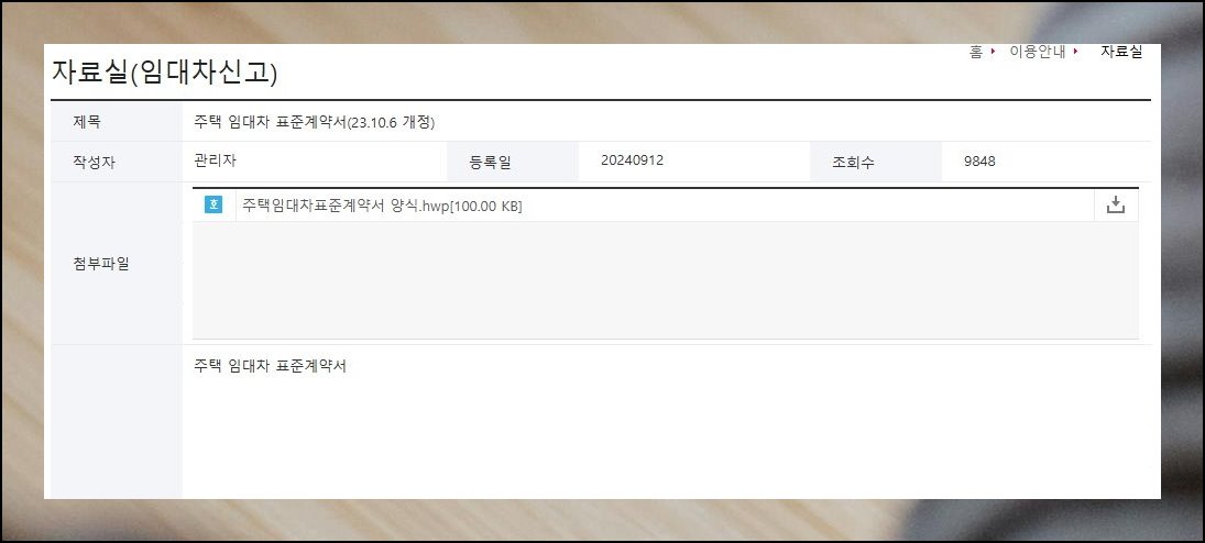 임대차 신고 보관함에 진입하면 다양한 공식 서류가 목록으로 펼쳐져 있어요. 전월세 계약에 활용해야 할 것은 목록 7번에 해당하는 주택임대차 표준 계약서 개정판입니다. 해지 확인서나 접수 용지 등 실무에서 쓸모 있는 자료도 폭넓게 갖춰져 있어요.