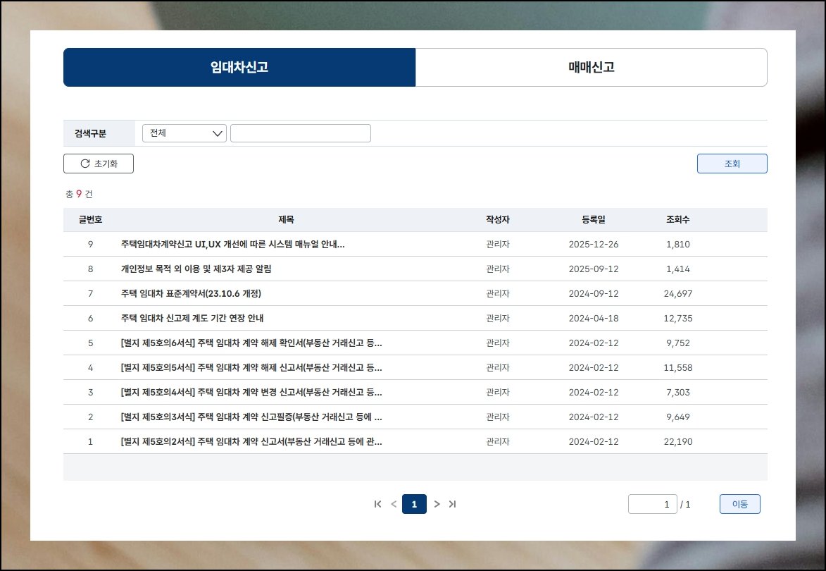해당 플랫폼에 들어왔으면 보관함 영역을 탐색할 순서예요. 상단 탭에서 자료실 버튼을 누르면 임대차 신고와 매매신고라는 두 갈래가 나타납니다. 위쪽에 위치한 임대차 신고 쪽을 선택해 주세요.