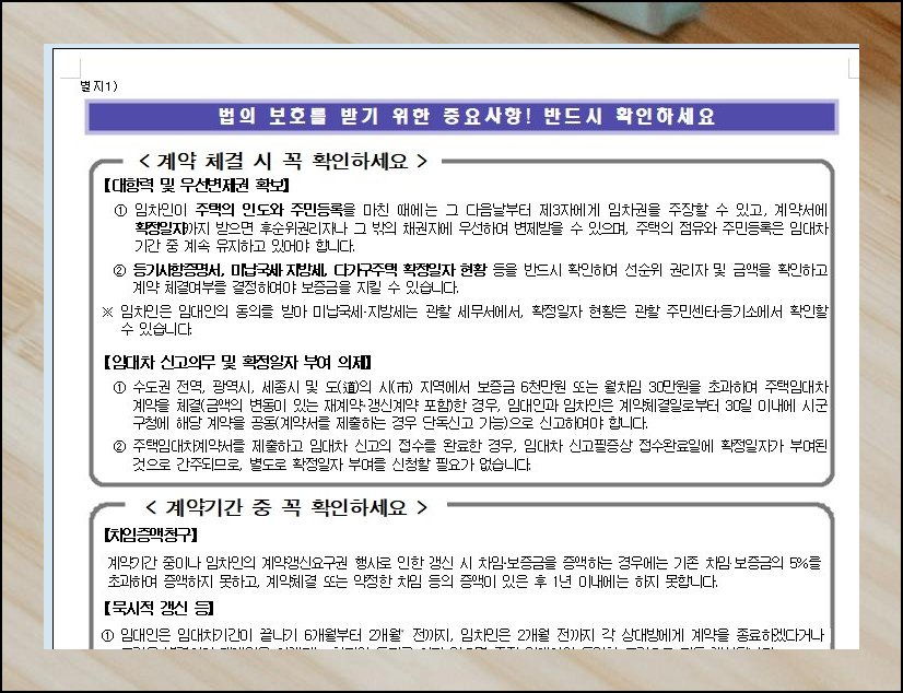 저장한 전월세 계약서 파일의 후면에는 절대 넘기면 안 되는 사항들이 적혀 있습니다. 거래 성립 시점부터 거주 기간 전반에 걸쳐 체크할 포인트가 구체적으로 기술되어 있어요. 대항력이나 우선변제권, 신고 의무, 확정일자, 임대료 인상 요구, 자동 연장 같은 주제는 집주인과 세입자 양쪽 모두 빠뜨릴 수 없는 핵심이니 꼭 정독해 보세요.