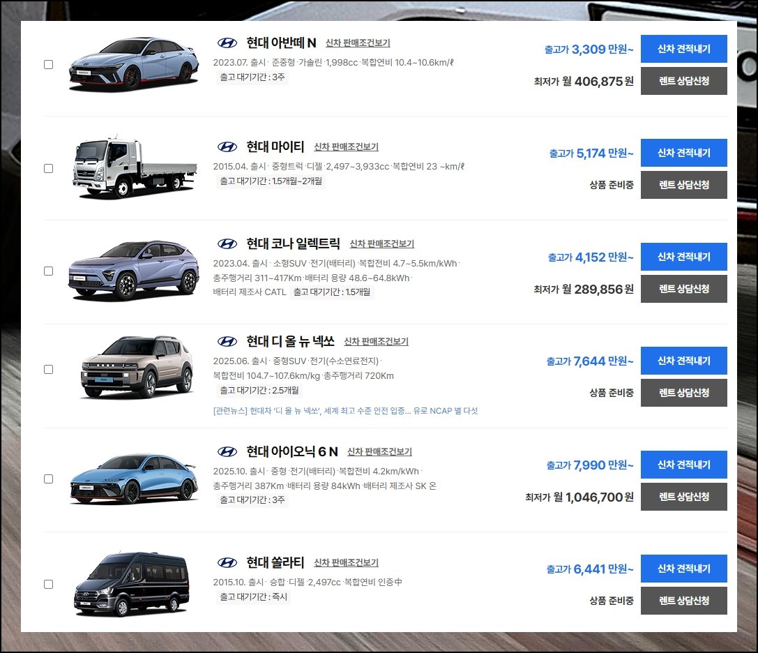 홈페이지 윗부분에서 신차 검색 탭을 클릭해보세요. 최근 나온 현대차 종류별 정보가 곧바로 뜹니다. 장기 렌트나 리스 안내도 함께 마련되어 있어요.