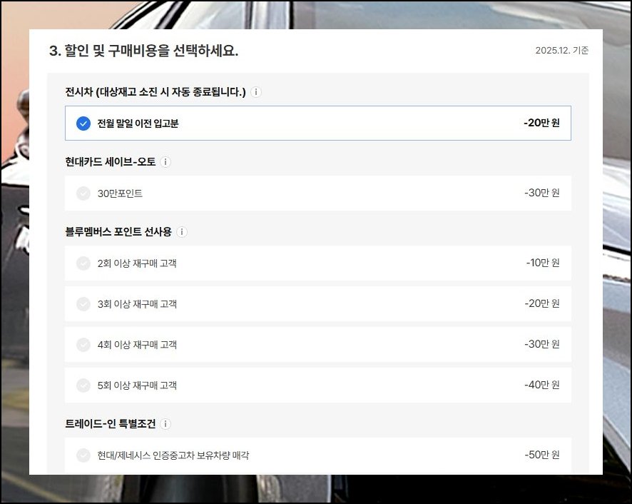 구매 조건에서 자기에게 해당하는 혜택을 빠짐없이 체크하세요. 현대차 할인은 시점과 차종별로 계속 바뀝니다. 건당 액수가 작아 보여도 전부 합치면 무시 못 할 수준이 돼요.