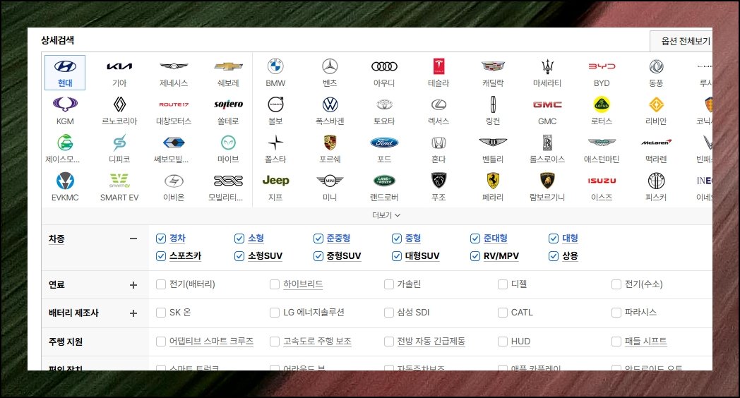 정밀 탐색 화면에서 브랜드를 현대차로 지정하세요. 세단이나 다목적 차량 같은 종류를 택하면 불필요한 결과가 사라집니다. SUV를 원한다면 컴팩트, 미드사이즈, 풀사이즈 중 적합한 규격을 골라보세요.