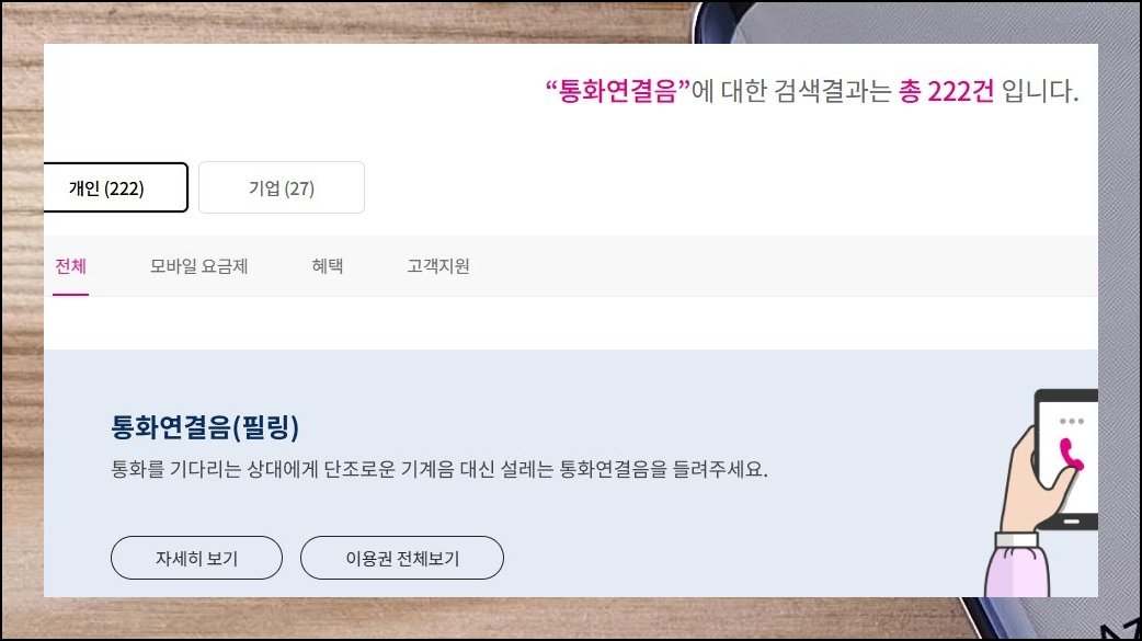 LG유플러스 가입자라면 공식 홈 상단 검색란에 뮤직 벨링이라고 쳐 보세요. 곧장 핸드폰 대기음 설정 페이지가 나타납니다. 복잡한 메뉴를 뒤질 필요 없이 검색 한 차례면 원하는 컬러링으로 손쉽게 교체 가능해요.