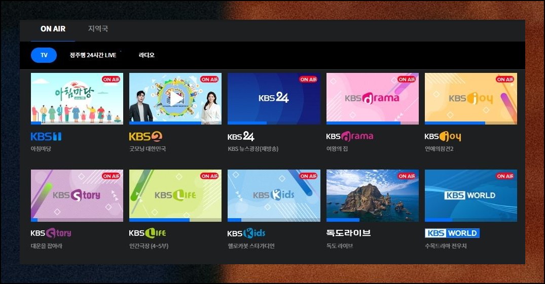 화면 좌측 상단의 ON AIR 아이콘을 선택하면 즉시 생방송이 뜹니다. 기다림 없이 곧장 원하는 콘텐츠를 감상 가능해요. 디지털 기기에 서툰 분들도 무료 사이트에서 손쉽게 TV보기를 할 수 있도록 조작이 간결하게 설계되어 있습니다.