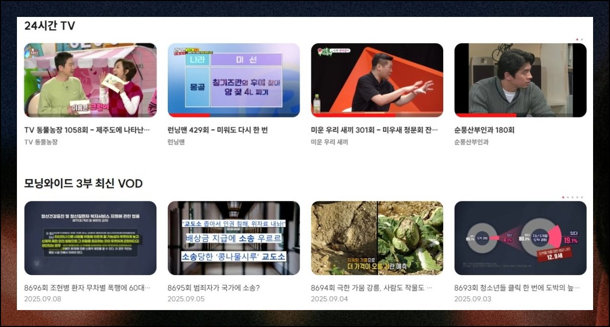 런닝맨, 미운 우리 새끼, TV 동물농장처럼 사랑받는 작품들을 무료로 시간 구애 없이 시청 가능해요. 하루 내내 접근이 열려 있으니 편성 일정에 맞춰 대기할 이유가 없습니다. 내가 편한 타이밍에 무료 TV보기를 즐기면 그만이에요.