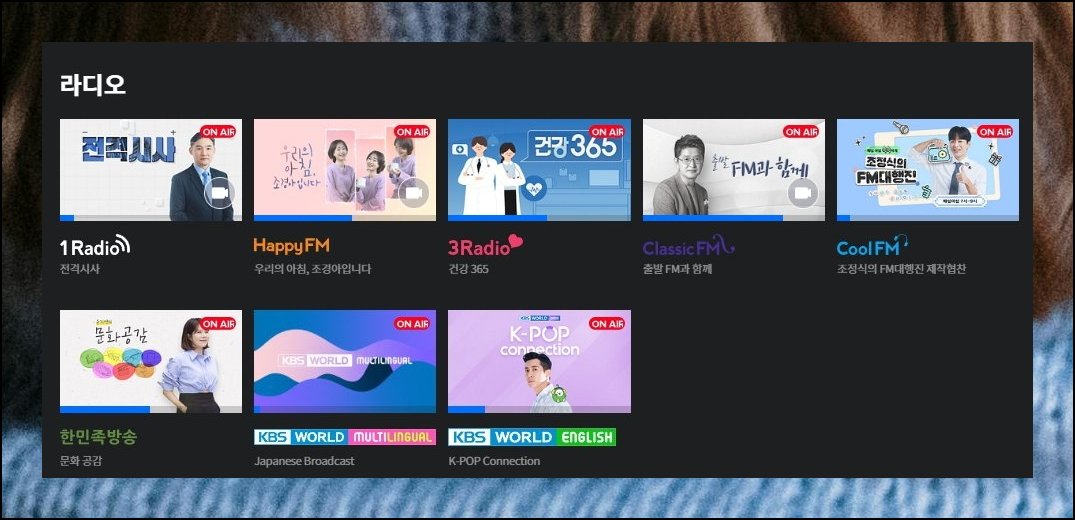 음악 채널부터 뉴스와 교양까지 폭넓은 오디오 라인업이 갖춰져 있습니다. 흥미가 가는 장르를 골라 무료로 들어보세요. 청취 전용 환경 역시 잘 마련된 사이트라 쾌적하게 이용 가능해요.
