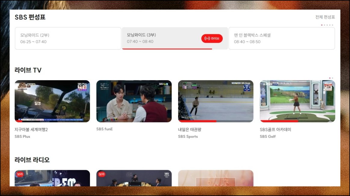 첫 화면에 진입한 뒤 라이브 아이콘을 터치해보세요. 오디오와 영상 모두 하나의 사이트에서 해결됩니다. 별도 소프트웨어를 내려받을 일도 없어 간편하게 TV보기가 가능해요.