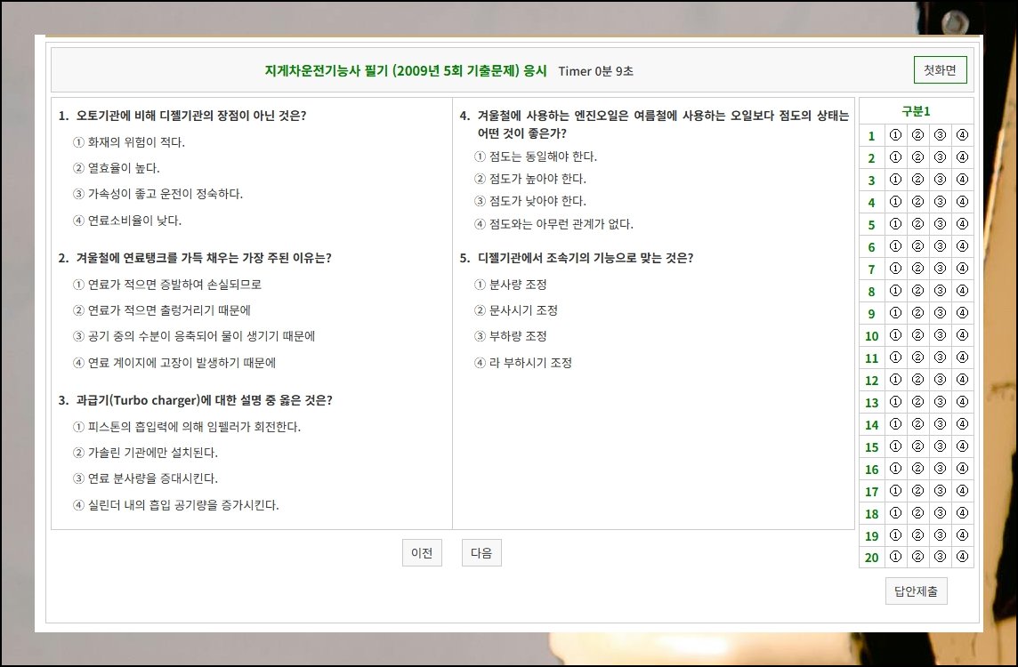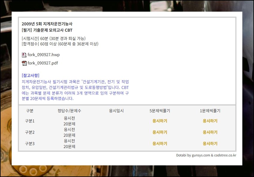 지게차 자격증 필기 준비를 도와주는 온라인 서비스들이 점점 다양해지고 있어요. 건시스템과 CBT 전자문제집이 수험생들 사이에서 특히 주목받고 있습니다. 이런 서비스들은 단순히 파일을 내려받는 수준에 그치지 않고, 실제 시험과 흡사한 가상 환경에서 직접 연습할 수 있는 기능도 함께 제공해요. 내려받은 자료로 기초 개념을 다지고 온라인 모의 환경으로 실전 감각까지 키운다면 탄탄한 수험 준비가 가능합니다.