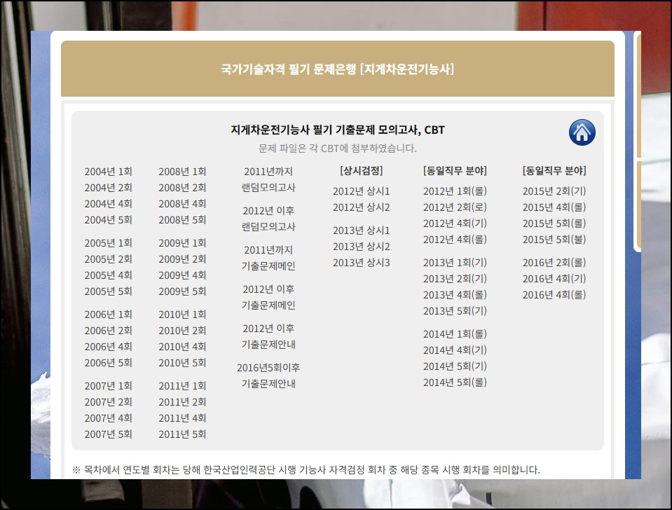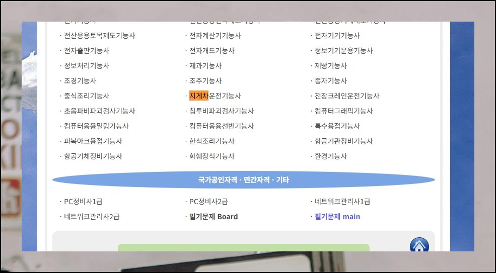 메인 화면에 들어서면 분야별로 깔끔하게 정리된 자격증 목록이 한눈에 들어와요. 건설, 전기, 기계 등 직종에 따라 나뉘어 있어서 원하는 종목을 찾기 어렵지 않습니다. 카테고리 구성이 직관적이라 처음 방문해도 원하는 항목을 바로 찾을 수 있어요. 지게차 운전기능사는 보통 기계나 기술 계통 항목 안에서 확인할 수 있습니다.