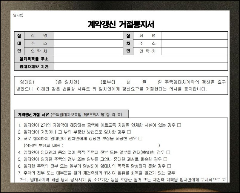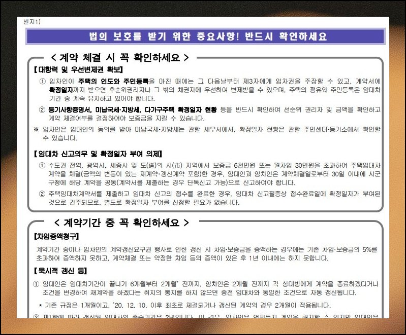 표준 계약서의 가장 마지막 페이지에는 세입자가 법으로 보호받는 데 핵심이 되는 사항들이 빼곡히 모여 있어요. 전세든 월세든 임대 약속에 도장을 찍기 전에 처음부터 끝까지 한 번쯤 시선을 두고 천천히 읽어 보시길 권합니다. 별지2 자리에는 갱신 거절통지서 양식까지 함께 수록해 두었기에 그런 상황이 닥치면 바로 꺼내어 쓰시면 됩니다. 이런 안내문을 머리에 충분히 새겨 두면 한층 든든한 임대차 관계를 꾸려나갈 수 있어요. 그러니 어떤 종류의 표준 계약서를 챙기든 짚어볼 부분은 본인이 반드시 직접 점검해 보시기 바랍니다.