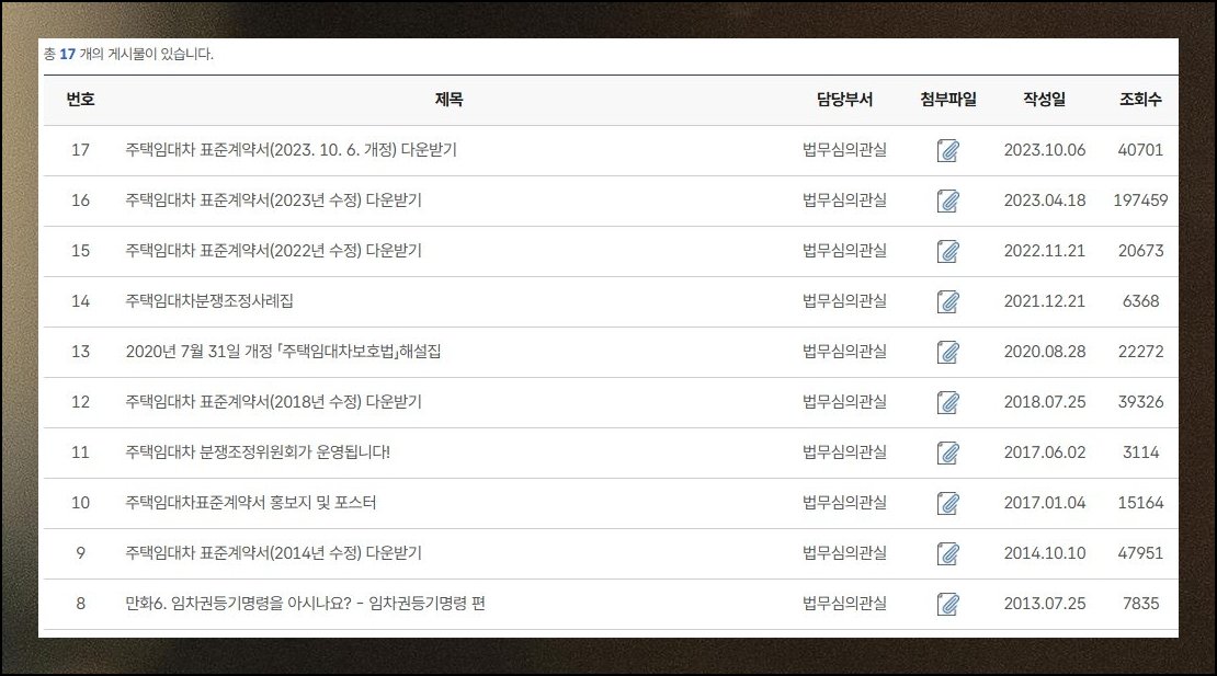 새로 들어선 화면을 살피면 표준 양식이 크게 두 갈래로 나뉘어 제공된다는 점이 보입니다. 직접 종이에 옮길 용도라면 [사용용]이라고 적힌 파일을 눌러 무료로 챙겨 가시면 됩니다. hwp 파일 바로 아래쪽에는 해당 서식이 어떤 성격을 띠는지가 짤막하게 풀이되어 있으니 한 번쯤 훑어보면 좋아요. 이어서 [자료실] 항목으로 발길을 옮기면 그동안 정비된 여러 계약서 판본이 차곡차곡 쌓인 게시판을 만나게 됩니다. 맨 위쪽에 올라온 글을 짚어 들어가면 현재 시점에서 가장 새로운 임대차 표준 서식을 손에 쥘 수 있습니다.