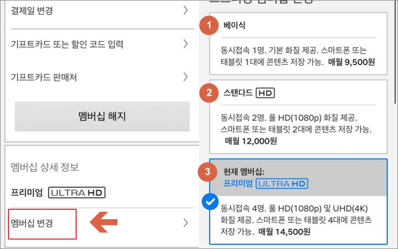 동시 접속자, 가격, 화질, 저장 기능 등을 감안하여 자신에게 맞는 멤버십을 선택하면 돼요.