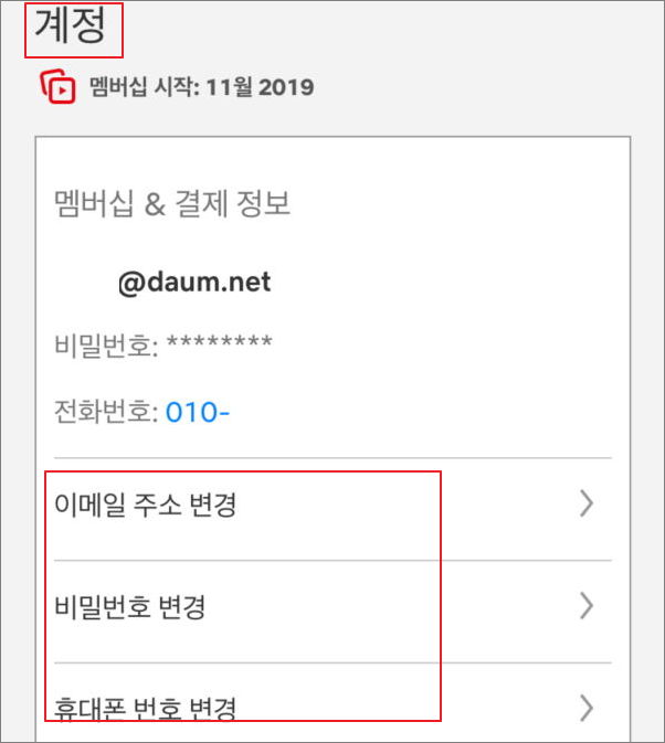 이메일 주소, 비밀번호, 휴대폰 번호를 변경할 수 있죠.