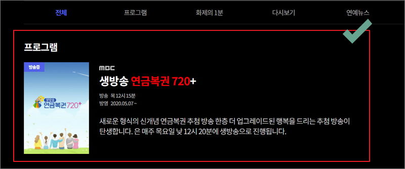 검색 결과를 보시면 MBC의 생방송 연금복권 720+를 찾을 수 있을 거에요.