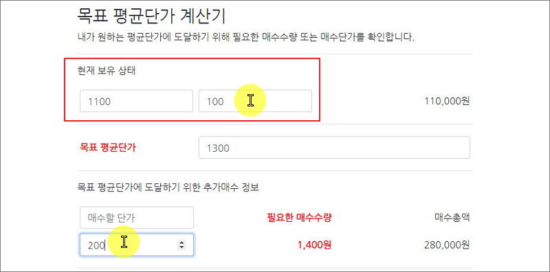 그럼 현재 보유하고 있는 주식을 목표 평균단가로 맞추기 위해 얼마나 매수해야 하는지 쉽게 계산할 수 있어요.