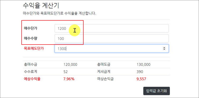 3가지 값을 입력하면 예상 수익율과 손익금을 쉽게 알아낼 수 있어요.