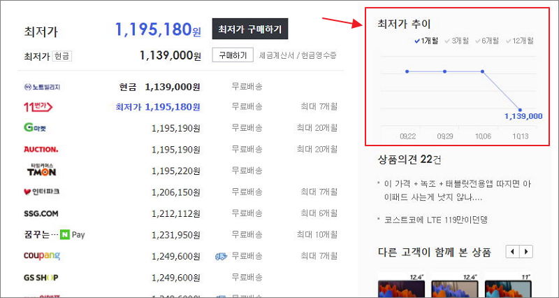 1개월에서 12개월까지 기간을 조회해볼 수 있는데요. 같은 태블릿 pc에 대하여 날짜별 가격비교를 할 수 있어요.