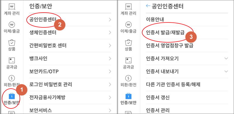 ▼ 저는 우리은행을 주로 사용하기 때문에 우리은행 어플을 설치했습니다. 어떤 은행을 사용하던 공인인증서 발급 방법은 대부분 비슷합니다. 그렇기 때문에 우리은행을 기준으로 알려드린 방법을 숙지한다면 다른 은행에서도 쉽게 발급을 받을 수 있습니다. 그럼 어플을 실행한 상태에서 "전체 메뉴"를 클릭합니다. 그럼 "인증/보안" 메뉴를 찾을 수 있습니다. 여기에서 "인증서 발급/재발급" 버튼을 터치합니다.