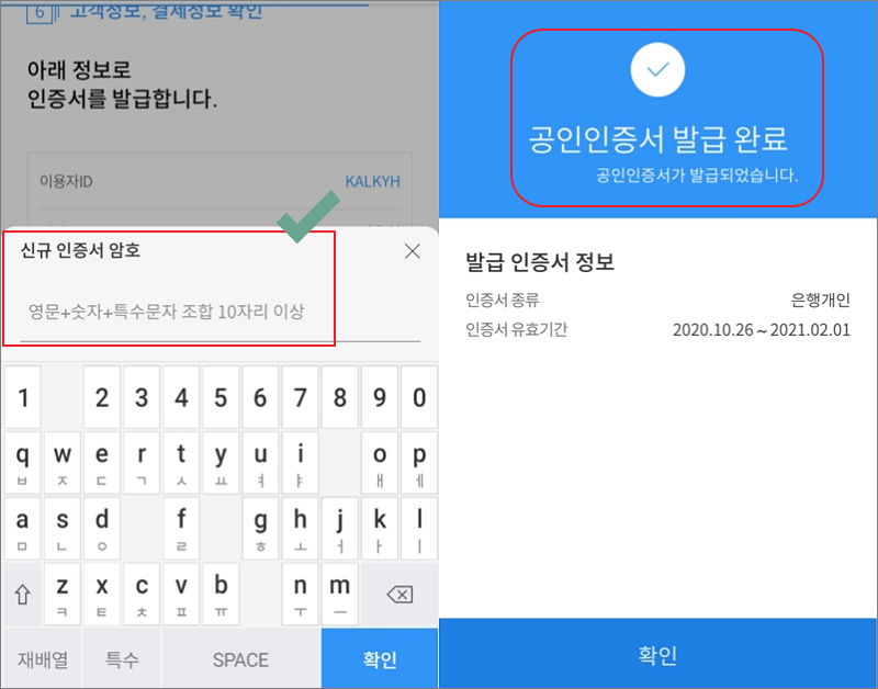 ▼ 이번에는 스마트폰 공인인증서를 사용할 때 요구되는 암호를 설정할 차례입니다. 영문, 숫자, 특수문자를 조합한 10자리 이상을 입력하면 됩니다. 암호를 설정하면 공인인증서 발급이 완료됩니다.