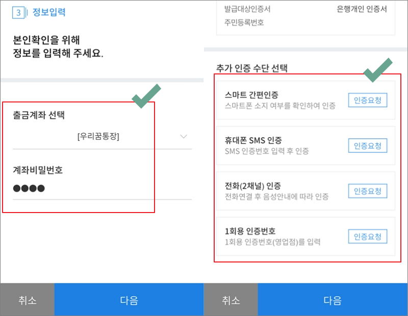 ▼ 본인 확인을 할 차례 입니다. 출금계좌를 선택하고, 계좌 비밀번호를 입력합니다. 추가 인증이 필요한데, 본인 명의의 스마트폰을 사용하고 있다면 쉽게 인증을 할 수 있습니다. 저는 휴대폰 SMS 인증을 사용해 보겠습니다.