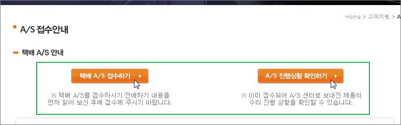 ▼ 이곳에서는 택배를 통해 A/S 서비스를 진행하고 있습니다. A/S 접수 안내 페이지에 있는 "택배 A/S 접수하기" 버튼을 클릭하면 수리 접수가 가능합니다. 이전에 확인해야 할 사항이 있습니다. 다음 단계에서 알려드리겠습니다. 수리를 하기 위해 택배로 제품을 보낸 경우라면 이곳에 있는 "A/S 진행상활 확인하기" 서비스를 통해 수리 상황을 알 수 있다는 점도 알아주시길 바랍니다.