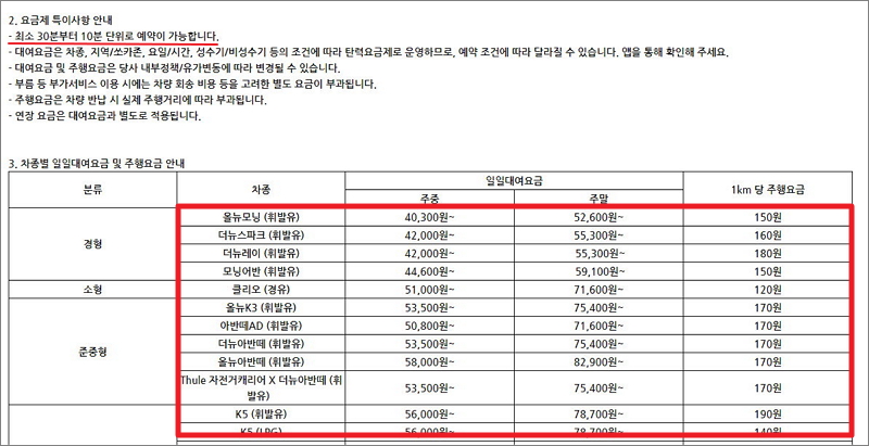 ▼ 쏘카의 경우 최소 30분에서부터 10분 단위로 렌트카를 사용할 수 있습니다. 당연히 한달 동안에도 사용할 수 있습니다. 공식 사이트에는 차종별 일일대여요금과 주행요금을 확인할 수 있는 표를 게시하고 있습니다. 이를 통해 자신의 상황에 맞게 이용하고자 하는 서비스를 선택하면 됩니다.