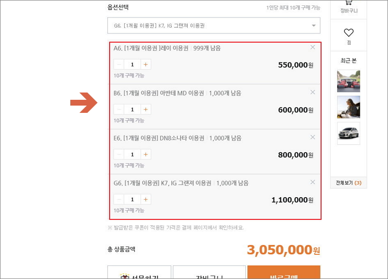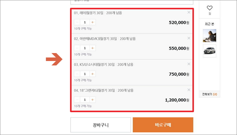 ▼ 다른 업체의 상품 판매글을 클릭해 보았습니다. 이전 단계에서 살펴본 업체보다 렌트카 이용 비용이 조금 더 높은 편입니다. 가격이 높은 만큼 서비스 품질이 뛰어날 수 있습니다. 그렇기 때문에 비용과 함께 후기를 꼼꼼히 살펴보는 것이 좋습니다.