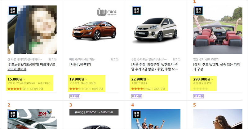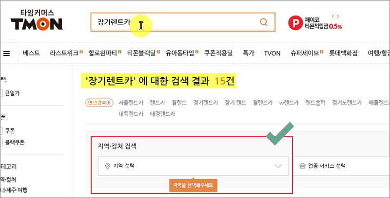 ▼ 티몬 사이트에서 장기 렌트카를 검색해 보았습니다. 15건의 판매 정보를 찾았습니다. 가까운 위치에 있는 렌트카 업체를 이용하고 싶은 경우 지역 검색 기능을 사용하면 됩니다. 참고로 같은 모델을 이용하는 경우라도 이용 기간에 따라 하루 기준 렌트카 비용이 다릅니다. 보통 짧은 기간 동안 이용할수록 비싸고, 오랜 기간 사용하는 경우 평균 가격이 낮아집니다.