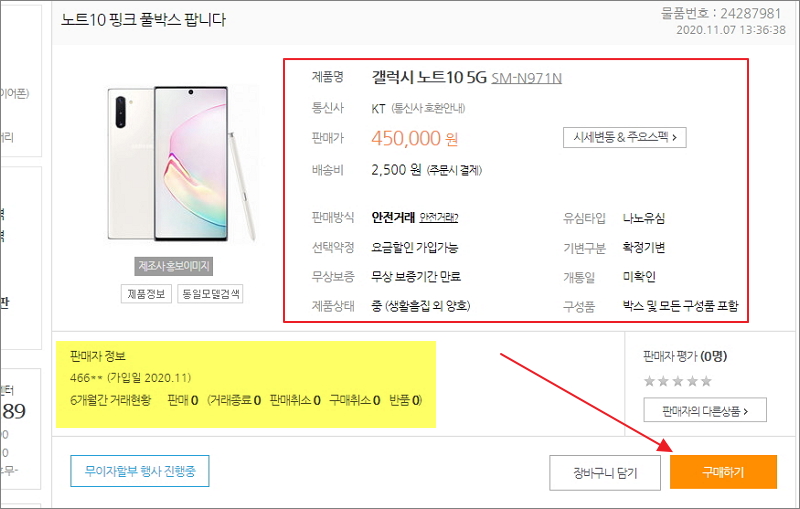 ▼ 저는 최근 저렴하게 판매되고 있는 갤럭시 노트10 5G 모델을 선택해 보았습니다. 선택약정 여부나 개통일, 구성품 여부 등 여러 가지 사항을 확인할 수 있습니다. 파는 사람에 대한 정보도 있으니 이러한 것도 참고하는 것이 좋습니다. 구매를 하고 싶다면 "구매하기" 버튼을 클릭한 후 안내에 따라 진행하면 됩니다.