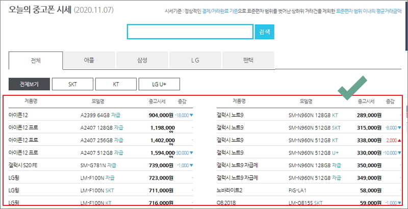 ▼ 매일 업데이트 되는 중고폰 시세표가 나타났습니다. 많은 사람들이 찾는 브랜드인 애플, 삼성, LG 휴대폰에 대한 시세 정보를 확인할 수 있습니다. 같은 모델이라고 하더라도 자급제 여부나 개통한 통신사에 따라 파는 가격이 달라짐을 알 수 있습니다.