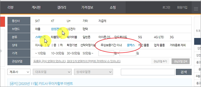 ▼ 이번에는 중고 휴대폰을 파는 게시물을 찾아보겠습니다. 메뉴에서 "중고장터"를 클릭한 후 "물품 검색"을 선택합니다. 새롭게 열린 페이지를 통해 여러 중고 휴대폰을 파는 게시물을 찾을 수 있습니다. 이곳에서는 세부 조건을 지정하여 검색이 가능합니다. 지정할 수 있는 조건으로는 통신사, 브랜드, 상태, 가격 등입니다.