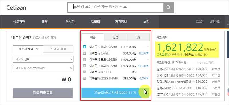 ▼ 첫 번째로 알려드리는 곳은 세티즌입니다. 중고 휴대폰에 대한 시세를 알아보기에도 정말 좋은 곳입니다. 나름 안전한 구매를 위한 장치도 마련되어 있어 초보자도 이용하기 좋습니다.